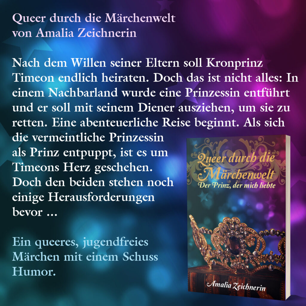 Last but not least eine Eigenwerbung: Ich selbst habe ein queeres Märchen für Jugendliche und Erwachsene geschrieben: „Queer durch die Märchenwelt: Der Prinz, der mich liebte“. Darin tauchen zwar mehrere Figuren aus den Grimmschen Märchen auf, aber ich verwende sie eher für humorvolle Einlagen.